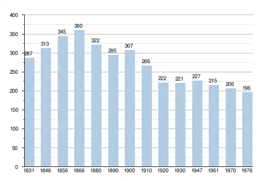 - Bronnen:NIS, Opm:1831 tot en met 1970=volkstellingen, 1976= inwoneraantal op 31 december
