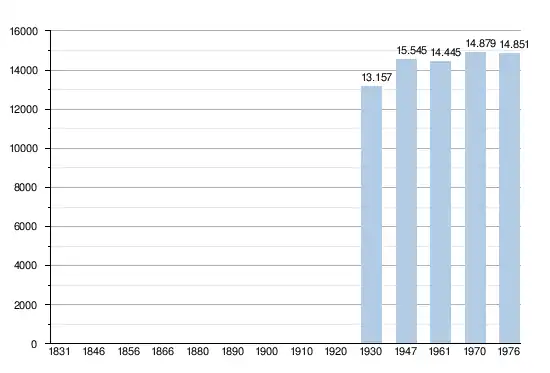 - Bronnen:NIS, Opm:1930 tot en met 1970=volkstellingen, 1976 inwoneraantal op 31 december