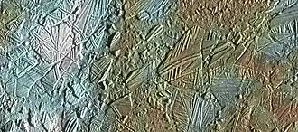 - ↑ Geissler, P.E. et al. (1998). Evolution of Lineaments on Europa: Clues from Galileo Multispectral Imaging Observations. Icarus 135: 107-126. DOI: 10.1006/icar.1998.5980.