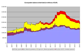 - ↑ Dit is het "rode gebied" in deze grafiek, bestaande uit aankopen van covered bonds (uiteindelijk circa € 60 miljard) en staatsleningen. De ECB verstrekte geen nadere details omtrent de debiteuren, looptijden of prijzen.