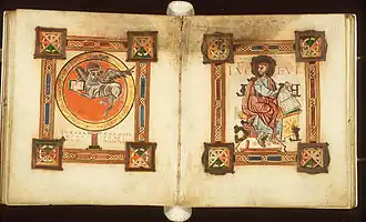 - fol. 16v-17r: sierbladzijden Mattheus (symbool, portret, incipit, initiaal)