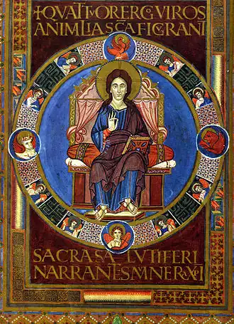 De Majestas Domini, afgebeeld bovenaan het artikel, is een mooi voorbeeld van het feit dat de artiest(en) niet altijd slaafs de Byzantijnse voorbeelden volgden. De randversiering is in het goud uitgevoerd en toont geometrische motieven gevormd met parels. In het binnenkader zien we naast fel gekleurde gedeeltes nog het Insulaire vlechtwerk in de hoeken. In het midden zien we Christus in de gouden hemelcirkel gezeten op zijn troon. De tetramorf geeft de eindpunten van het kruis aan en in de hemelcirkel zien we de engelen die God aanbidden.[2]