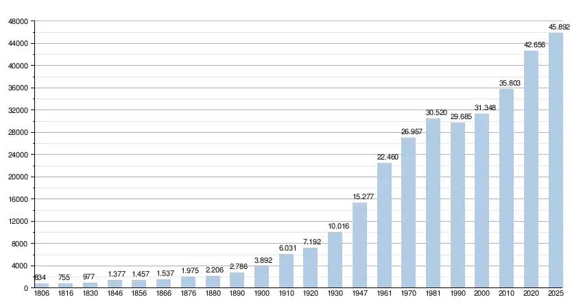 - Bronnen:NIS, Opm:1806 tot en met 1981=volkstellingen; 1990 en later= inwonertal op 1 januari