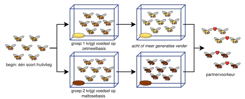 Er zijn zowel uit de natuur als bij experimenten echter ook gevallen van soortvorming binnen veel kortere tijd bekend. De plant morgenster bijvoorbeeld werd aan het begin van de 20e eeuw geïntroduceerd in Noord-Amerika. In de jaren 1940 verscheen uit kruisingen van verschillende populaties een nieuwe soort, die geen nakomelingen kan krijgen met de oorspronkelijk geïntroduceerde soort.[24] Bij fruitvliegen is zowel in de natuur als bij experimenten soortvorming waargenomen. Bij de fruitvlieg is in experimenten vorming van nieuwe soorten aangetoond, onder andere door de evolutiebioloog Theodosius Dobzhansky.[25] Een ander geslacht fruitvliegen, Rhagoletis, leeft normaal gesproken als parasiet op meidoorns. Ongeveer 150 jaar geleden is een aparte populatie ontstaan, die op appelbomen parasiteert.[26] Een ander geval waarbij geclaimd wordt dat een nieuwe soort is ontstaan is de populatie huismuizen op de Faeröereilanden, die morfologisch voldoende van andere populaties afwijkt om als nieuwe soort beschouwd te worden.[27]