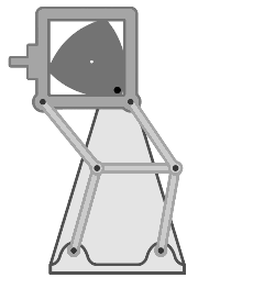 De zwarte punt in de reuleaux-driehoek is de aandrijfas. De gelijkmatige draaiing van deze as wordt omgezet in onderbroken lineaire bewegingen voor het filmtransport: om en om in de transportrichting en zijdelings. Zolang de punt van de driehoek in de transportrichting langs een rand glijdt, staat het frame in die richting stil en mag de projectorlamp aan. Het totale mechaniek is ingewikkelder: niet afgebeeld zijn het glijmechanisme dat de zijdelingse beweging neutraliseert en het mechanisme de film vooruit laat gaan en niet terug.) |