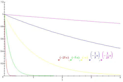 Daarin is de waarde van de grootheid op het tijdstip en de beginwaarde van de grootheid, dat wil zeggen de waarde op het tijdstip . Merk op dat exponentiële afname in wezen hetzelfde is als exponentiële groei met een negatieve relatieve groeisnelheid.