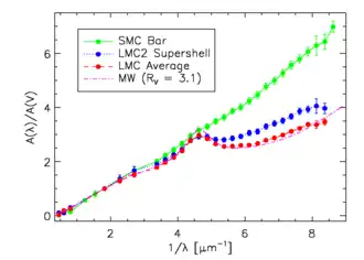 De vorm van de extinctiekromme hangt af van de samenstelling van het ISM, die varieert van per sterrenstelsel. In de Lokale Groep zijn de best bepaalde extinctiekrommen die van de Melkweg, de Kleine Magelhaanse Wolk (LMC in de afbeelding rechts), en de Grote Magelhaanse Wolk (GMC). In de LMC is een significant verschil in de ultraviolette extinctie met een zwakkere 2175Å-piek en grotere ver-uv-extinctie in het gebied geassocieerd met de LMC2-superschil (bij het starburstgebied 30 Doradus) dan elders in de LMC en in de Melkweg. In de SMC zijn grotere verschillen te zien: geen 2175Å-piek en zeer sterke ver-uv-extinctie in de stervormende Balk, en vrij normale extinctie in de rustigere Wing. Dit wijst op de samenstelling van het ISM in de verschillende stelsels. Eerder werd gedacht dat de verschillende gemiddelde extinctiekrommen in de Melkweg, LMC, en SMC het resultaat waren van het verschillende metaalgehalte in de drie stelsels. Het metaalgehalte in de LMC is ongeveer 40% van dat in de Melkweg, terwijl dat in de SMC 10% is. Het feit dat op sommige plaatsen in LMC en SMC de extinctiekromme zeer lijkt op die in de Melkweg, en dat in de Melkweg ook extinctiekrommen gevonden worden die lijken op die in de LMC2 superschil heeft geleid tot een nieuwe interpretatie. De variaties in extinctiekromme in de Magelhaanse Wolken en in de Melkweg kan veroorzaakt worden door verandering van het interstellaire stof door nabije stervormingsgebieden. Deze interpretatie wordt gesteund door werk aan starburststelsels (waarin perioden van extreem veel stervorming plaatsvindt) waarin gevonden is dat in hun extinctiekromme de 2175 Å ontbreekt.