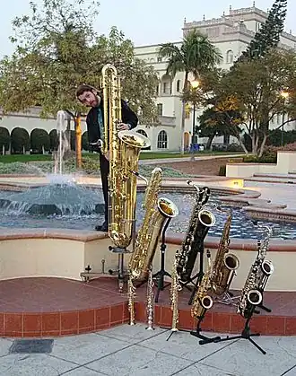 De familie van de saxofoons in de afbeelding wordt gekenmerkt door de conische metalen buis, applicatuur en het mondstuk met riet.