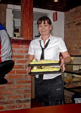 Het gerecht wordt meestal op een houten bord opgediend, decoratief versierd met de gebakken aardappelen, groenten en sla.