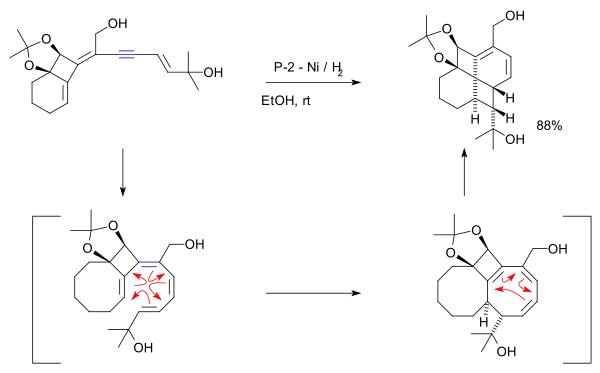 In de synthese van [4.6.4.6]fenestrenen en [4.6.4.6]fenestradienen wordt een ongebruikelijke cascade-reactie beschreven: een 8π-disrotatorische-6π-conrotatorische elektrocyclische reactie met als doel het aantal afzonderlijke reactiestappen in de synthese van een fenestraan te minimaliseren.[4]