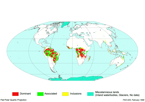 Ferralsolen beslaan wereldwijd ongeveer 750 miljoen hectare. Ze zijn vooral te vinden in de vochtige tropen op de continentale schilden van Zuid-Amerika (met name in Brazilië) en van Centraal-Afrika, (o.a. in Congo, Angola en Madagaskar).