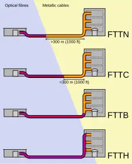 - Fiber to the node / neighborhood (FTTN) / Fiber to the cabinet (FTTCab)