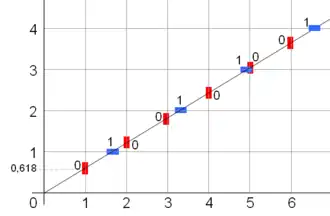 Men kan het woord van Fibonacci ook bekomen door de opeenvolgende snijpunten van een rechte lijn met helling of , met de horizontale en verticale lijnen van de gehele coördinaten (zie figuur hiernaast). is het gulden getal. De snijpunten met de horizontale lijnen duidt men aan met "1" en die met de verticale lijnen met "0".