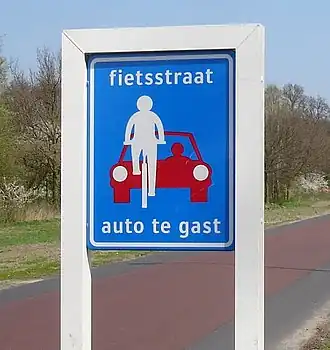 Het bord "Fietsstraat, auto te gast" werd in 2000 voor het eerst toegepast en is in opdracht van de gemeente Houten ontworpen door Rutger Ekhart van bureau Goudappel.