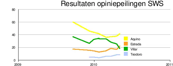 Al vanaf 2007 zijn er door diverse instanties populariteitspeilingen uitgevoerd. De grafiek hieronder presenteert de resultaten van de vier meest populaire kandidaten in onderzoeken van de Social Weather Stations. Er werd bij de onderzoeken gebruikgemaakt van de volgende vraagstelling: "Volgende de huidige grondwet zal de termijn van president Arroyo in mei 2010 aflopen en zullen er in mei 2010 verkiezingen worden georganiseerd voor een nieuwe president. Wie zijn in uw opinie de juiste leiders om president Arroyo op te volgens als president?