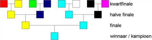 Zie onderstaand schema, in de kwartfinales wint geel van rood en blauw wint van groen, hierdoor strijden geel en blauw (de winnaars van de betreffende kwartfinales) in de halve finale tegen elkaar.