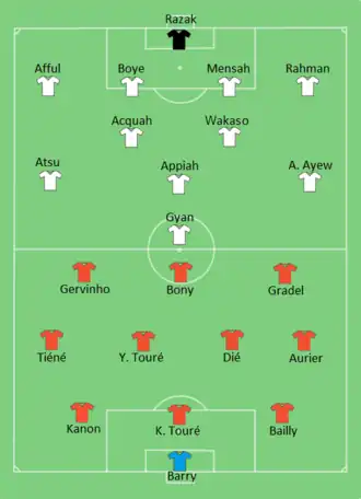 Na honderdtwintig minuten was de stand nog steeds 0–0. Beide teams gokten, vooral in de verlenging, op de counter en verdedigden vooral. Ghana had de betere kansen in de wedstrijd. Zo raakten Christian Atsu en André Ayew de paal, al schoot de Ivoriaanse middenvelder Max Gradel nog net over het doel. In de strafschopserie misten Wilfried Bony en Tallo Gadji de eerste twee Ivoriaanse strafschoppen, waarna het 0–2 stond voor Ghana. Door missers van Afriyie Acquah en Frank Acheampong werd het weer gelijk. Uiteindelijk hadden alle veldspelers al geschoten en moesten de doelmannen nog aantreden. Boubacar Barry schoot de bal achter Brimah Razak en hield daarna de strafschop van Razak tegen. Hierdoor won Ivoorkust met 9–8.