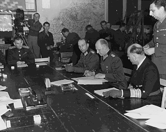 Op 4 mei tekende Von Friedeburg ter overstaan van Montgomery te Wendisch Evern, op de Lüneburger Heide, de overgave van de Duitse strijdkrachten in Noord-Duitsland, Nederland, Denemarken en Noorwegen, die de dag daarop inging. Daarna werd de Duitse delegatie overgebracht naar het geallieerde hoofdkwartier in de Franse stad Reims waar besprekingen begonnen over een algemene capitulatie. Kolonel-generaal Alfred Jodl vervoegde zich een dag later bij de Duitse delegatie in een ultieme poging om enkel voor de westerse mogendheden te capituleren. Toen dat niet lukte en de geallieerden dreigden alle Duitsers tegen te houden die voor de Russen op de vlucht waren, gaf Dönitz via de radio toestemming om de geallieerde eis in te willigen. Daarop ondertekende Jodl in de ochtend van 7 mei in Reims een akkoord over de onvoorwaardelijke overgave van alle Duitse strijdkrachten, die de dag daarop zou ingaan. Omdat de Sovjet-Unie bezwaar maakte tegen enkele bepalingen van de overeenkomst, werd in de nacht van 8 op 9 mei in het hoofdkwartier van generaal Georgi Zjoekov in Berlijn, in aanwezigheid van Russen, Amerikanen, Britten en Fransen, een nieuw capitulatiedocument ondertekend door generaal-veldmaarschalk Keitel (OKW), kolonel-generaal Stumpff (Luftwaffe) en admiraal Von Friedeburg. De Duitse delegatie keerde meteen daarop naar Flensburg terug.