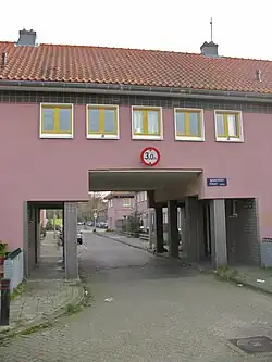 Roze huizen van het Floradorp aan de Kamperfoelieweg. -
