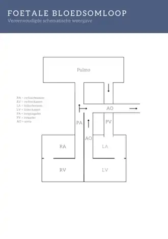 Het zuurstof- en voedingsstofrijke bloed van de placenta loopt via de ongepaarde navelstrengader (vena umbilicalis) en ductus venosus (en deels via de leverpoortader) naar de onderste holle ader (vena cava inferior). De twee harthelften functioneren nog in parallel omdat er twee kortsluitende verbindingen zijn tussen de rechter- en linkerharthelft: het ovale venster en de ductus Botalli. Een deel van het bloed gaat vanuit de rechterboezem via het ovale venster (foramen ovale) naar de linkerboezem. Een ander deel stroomt van de longslagader via de ductus arteriacus Botalli naar de lichaamsslagader (aorta). Deze twee aanpassingen in de foetus zijn effectief, omdat het bloed door drukverschillen eerder door het foramen ovale of ductus Botalli zullen gaan. Voor de geboorte wordt een beperkte bloedtoevoer naar de pulmonaire circulatie waargenomen, gemedieerd door de restrictieve eigenschappen van de alveoli. Bij foetale omstandigheden, waarin een aanzienlijk lage partiële zuurstofdruk in de alveoli in de longen heerst, volgt een reactie waarbij de pulmonaire arteriën vasoconstrictie ondergaan. Vasoconstrictie leidt tot een verhoogde vasculaire weerstand, wat de bloedtoevoer bemoeilijkt. Hierdoor stroomt het bloed eerder via het foramen ovale naar de linkerhelft of via de ductus Botalli naar de aorta. De nog niet uitgeklapte longen worden zo grotendeels omzeild.