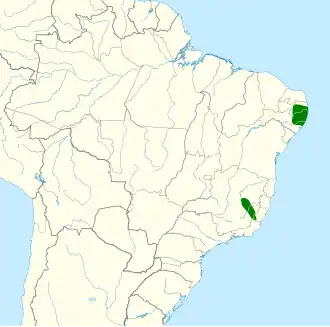 Deze soort is endemisch in oostelijk Brazilië. De grootste populatie komt voor in Pedra Talhada in de deelstaat Alagoas. De leefgebieden zijn de randen van natuurlijk bos dat grenst aan moerasgebieden, maar ook wel suikerrietvelden.[1]