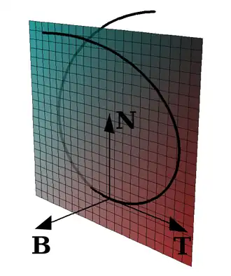 Het zogenaamde Frenet-Serret-coördinatenstelsel wordt bepaald door de drie eenheidsvectoren langs de raaklijn, de normaalvector en de binormaalvector die loodrecht op elkaar staan. Zij zijn gedefinieerd door: