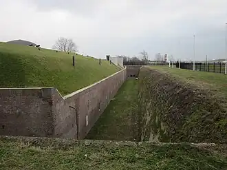 Nadat het metselwerk gereed was werden tegen en op het escarpgebouw en het contrescarpgebouw lagen zand en klei aangebracht. Deze lagen beschermden de ondergelegen gebouwen. De dikte bedroeg 3 meter aan zand en een halve meter aan klei, dat afgedekt was met graszoden.