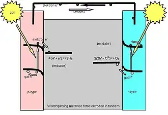 Een typische cel bestaat uit een halfgeleidende fotoanode en een metaalkathode die in een elektrolyt is ondergedompeld.