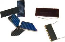 - polykristallijn silicium (poly-Si of mc-Si) wordt gemaakt door vloeibaar silicium in vierkante gietvormen te gieten. Het productieproces is eenvoudiger en goedkoper. De grote blokken gesmolten silicium worden voorzichtig gekoeld en in vaste vorm gebracht. De donkere plekken die erop zichtbaar zijn, zijn de ongestructureerde smeltplekken tussen de verschillende kristallen in het blok. De kristallen sluiten niet goed op elkaar aan en daarom is het rendement van de cellen lager. Polykristallijne siliciumplakjes met een dikte van 180 tot 350 micrometer worden van het gegoten blok gezaagd (door middel van draadzagen). De plakjes hebben bijvoorbeeld een zwakke p-type dotering, voordat aan het oppervlak een n-type dotering wordt uitgevoerd. Er vormt zich een pn-overgang op een paar honderd nanometer onder de oppervlakte. Grote fabrikanten gebruiken meestal polykristallijn silicium voor zonnecellen, omdat de productiekosten van monokristallijne cellen hoger liggen.
