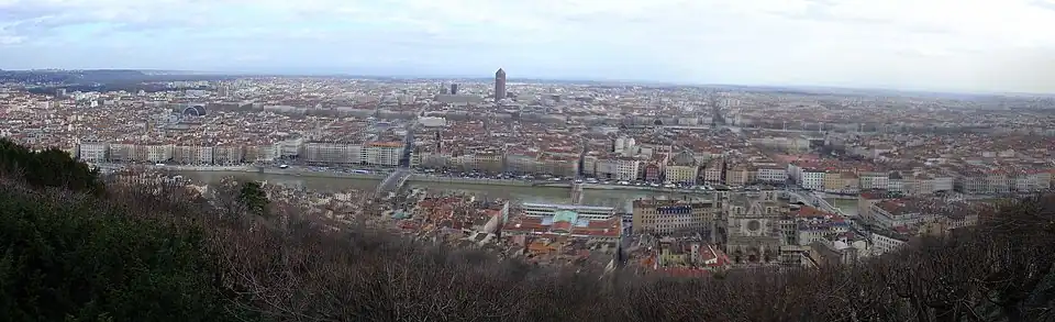 Vanaf Fourvière is er uitzicht over het schiereiland tussen de Rhône en Saône, de oostelijke wijken van de stad en de vlakte van de Neder-Dauphiné, waarbij het zicht verdergaat tot aan de Bugey, bij de Chartreuse, en naar de Franse Alpen. Wanneer het mooi weer is, is zelfs de Mont Blanc te zien.