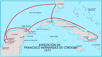 Hij werd op 8 februari 1517 door gouverneur Diego Velázquez de Cuéllar van Cuba op weg gestuurd. Hij ontdekte Yucatán en de beschaving van de Maya. Tijdens deze reis stierf de helft van zijn soldaten. Hernández de Córdoba zelf stierf na zijn terugkomst in Havana aan zijn verwondingen.
