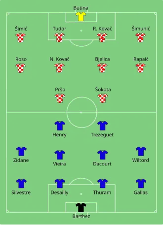 In het tweede duel speelde Frankrijk gelijk tegen Kroatië. De Fransen kwam op voorsprong via een eigen doelpunt van Igor Tudor. De Kroatische verdediger verlengde een vrijschop van Zidane in doel: 0-1. Aan het begin van de tweede helft bracht Milan Rapaić de score opnieuw in evenwicht. De Kroaat zette een strafschop om: 1-1. Vier minuten later strafte aanvaller Dado Pršo slecht wegwerken van aanvoerder Marcel Desailly af. De Fransman trapte in zijn eigen strafschopgebied naast de bal, waardoor Pršo het leer voorbij Barthez kon knallen: 2-1. Na iets meer dan een uur spelen strafte David Trezeguet een slechte terugspeelbal af. Doelman Tomislav Butina werd onder druk gezet door de Franse spits, die de bal in het lege doel trapte: 2-2.
