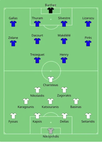 Door de zege werd Frankrijk groepswinnaar. Daardoor mocht het elftal van Santini het in de kwartfinale opnemen tegen Griekenland, de revelatie van het EK. De erg behoudend spelende Grieken kwamen na iets meer dan een uur op voorsprong. Aanvoerder Theodoros Zagorakis brak op de rechterflank door en verstuurde een voorzet richting Spits Angelos Charisteas, die het leer knap voorbij Barthez kopte: 0-1. Frankrijk ging nadien nog op zoek naar de gelijkmaker, maar de Grieken hielden stand en plaatsten zich voor de halve finale.