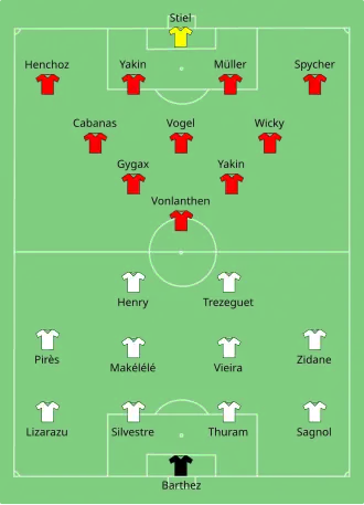 Voor het derde duel greep Santini terug naar de centrumverdedigers Lilian Thuram en Mikaël Silvestre, waardoor aanvoerder Desailly uit het elftal verdween. Frankrijk nam het in de laatste groepswedstrijd op tegen Zwitserland. Na twintig minuten opende Zidane de score. Hij kopte een hoekschop van Robert Pirès voorbij de te laat uitgekomen doelman Jörg Stiel: 0-1. Enkele minuten was de score opnieuw in evenwicht. De Zwitserse PSV-aanvaller Johan Vonlanthen strafte slecht uitverdedigen van de Fransen af met een lage schuiver: 1-1. In de 75e minuut liet Santini aanvaller Louis Saha invallen. De Franse spits verlengde meteen een lange bal tot bij Thierry Henry, die niet aarzelde en het leer in het Zwitserse doel prikte: 1-2. Enkele minuten later trof Henry opnieuw raak. De spits van Arsenal sneed naar binnen en trapte de bal in de korte hoek: 1-3. Ondanks de twee doelpunten van Henry was het Zidane die na afloop opnieuw verkozen werd tot man van de wedstrijd.