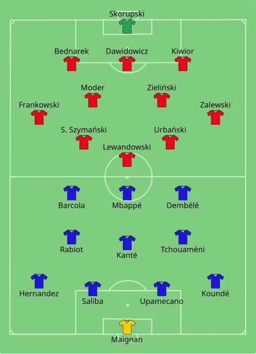 Frankrijk was voorafgaand aan zijn laatste groepswedstrijd, op 25 juni 2024 tegen het al uitgeschakelde Polen in Dortmund, al verzekerd van kwalificatie voor de knock-outfase. De Poolse doelman Łukasz Skorupski redde in de eerste helft schoten van Theo Hernández, Ousmane Dembélé en Mbappé, die met een masker was teruggekeerd in de basiself, terwijl Maignan een kopbal van de Poolse aanvoerder Robert Lewandowski stopte. Nadat Skorupski in de tweede helft wederom een schot van Mbappé stopte, werd hij wel door Mbappé geklopt vanaf de penaltystip, nadat Jakub Kiwior een overtreding had gemaakt op Dembélé. In de 77ste minuut mocht ook Lewandowski aanleggen voor een strafschop, nadat Dayot Upamecano een overtreding had gemaakt op Karol Świderski. Zijn poging werd in eerste instantie gekeerd door Maignan, maar die was te vroeg van de doellijn gestapt, waarna Lewandowski bij de tweede poging raak schoot. Zo werd er met 1–1 gelijkgespeeld en eindigde Frankrijk met vijf punten als tweede in de groep.[8]