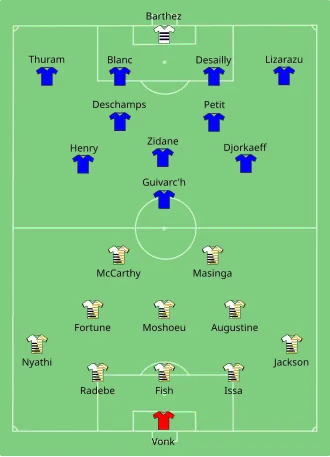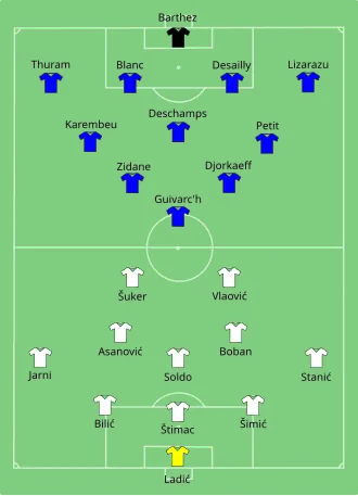 Voor de derde groepswedstrijd liet Jacquet enkele spelers rusten. Djorkaeff nam de plaats van de geschorste Zidane in, terwijl in de verdediging Vincent Candela, Christian Karembeu en Franck Lebœuf hun debuut mochten maken. Op het middenveld kreeg Patrick Vieira zijn eerste basisplaats op het WK. Frankrijk won het duel met 2-1 dankzij een penaltygoal van Djorkaeff en doelpunt van Petit.