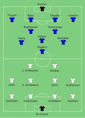 In zijn tweede groepswedstrijd deed Frankrijk nog beter. Les Bleus hadden geen moeite met het Saoedi-Arabië van Carlos Alberto Parreira, de Braziliaanse bondscoach die vier jaar eerder wereldkampioen was geworden met zijn vaderland. Via doelpunten van Henry (2x), David Trezeguet en Bixente Lizarazu werd het 4-0 voor de Fransen. De uitsluiting van Zinédine Zidane was echter een domper op de feestvreugde. De spelverdeler kreeg na zo'n 70 minuten rood voor natrappen op de Saoedi-Arabische aanvoerder Fuad Amin.