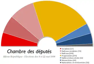 Op 8 en 22 mei 1898 werden er in Frankrijk parlementsverkiezingen gehouden. Hoewel de gematigde republikeinen (die aan de verkiezingen meededen onder de naam Progressieve Republikeinen) iets verloren, bleef zij de grootste fractie.