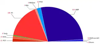 | Union pour un Mouvement Populaire | UMP | 10.289.737 | 39.54% | 313 | |