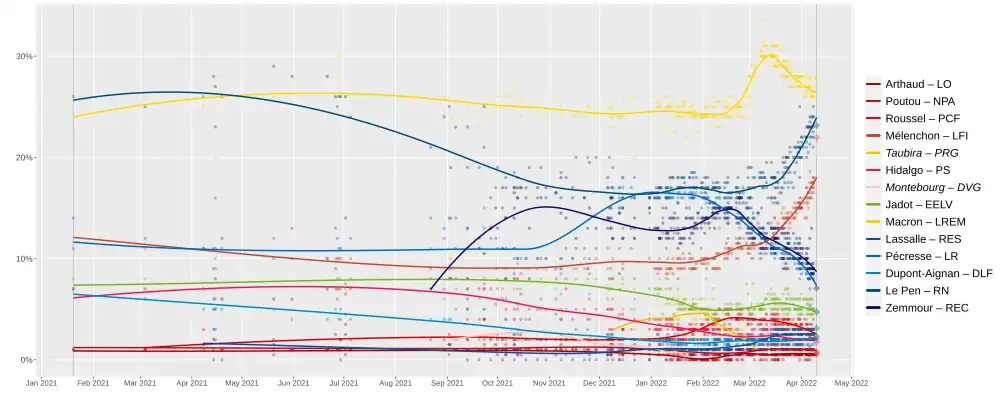 Opvallend aan de peilingen is het terugvallen van de populariteit van Zemmour en Pécresse na het Russische inval in Oekraïne, en de inhaalbeweging van Le Pen ten opzichte van Macron.[8] Macron en Le Pen waren bij het ingaan van de verkiezingen de grote favorieten om door te stoten naar de tweede ronde.[8]