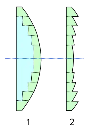 2. Een bolle fresnellens, waarin alleen de nuttige ringen zijn opgenomen.