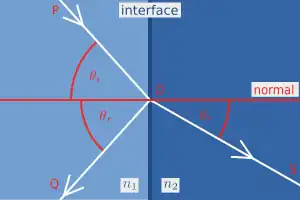 In de bijgaande figuur treft een invallende lichtstraal PO in O het grensvlak tussen twee media (stoffen) met brekingsindex n1 en n2. Een deel van de straal wordt weerkaatst als de straal OQ en een ander deel gebroken als de straal OS. De hoeken die de invallende (i = invallend), weerkaatste (r = reflectie) en gebroken (t = transmissie) bundels maken met de normaal op het grensvlak worden aangeduid met respectievelijk θi, θr en θt. Het verband tussen die hoeken is de reflectiewet en de wet van Snellius.