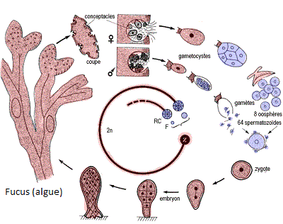 De mannelijke gameten (zoösporen, zwermen) worden gevormd door meiose op vertakte antheridia binnen de conceptakels. De eicellen ontstaan op oögonia met korte steel. Wanneer de algen bij eb uitdrogen, worden de gameten naar de oppervlakte geduwd en weggespoeld en gemengd met het opkomend tij. De eicellen trekken de mannelijke geslachtscellen aan met behulp van de koolwaterstoffucosesnelheid. Na bevruchting en versmelting van de celkernen (karyogamie) zet de zygote zich vast, ontkiemt en vormt een nieuwe, diploïde thallus. Na de belangrijkste rijpingsperiode worden de vruchtlichamen vernieuwd.