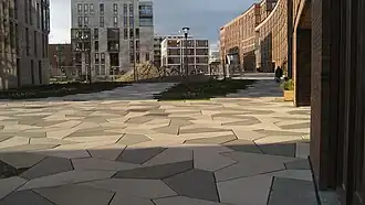 - alle bestrating is uitgevoerd in vijfhoekige tegels in allerlei vormen, maten en grijstinten