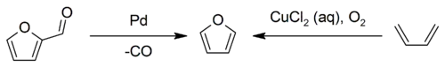 Furaan kan gevormd worden door de decarboxylering van furfural of de katalytische oxidering van 1,3-butadieen: