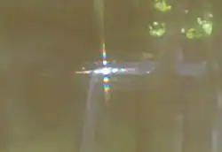 - ↑ a b Men kan interferentie op een eenvoudige manier waarnemen met een simpel experiment. Kijk daartoe door een niet te strak geweven weefsel (bijvoorbeeld een oude zakdoek, of een wat verder van het oog gehouden vitrage) naar een ver verwijderd licht. Men ziet dan een kruisvormig patroon van lichtvlekken, waarvan de intensiteit afneemt naarmate ze verder van het midden van het patroon zijn verwijderd.