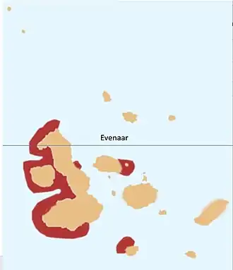 | Verspreiding van de galapagospinguïn. Rood: zeegebied waarin de penguïn foerageert. De evenaar is op de kaart aangegeven. | |||||||||||||
