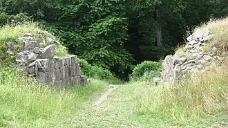 Tegen het jaar 1100 werd de burcht in het westen versterkt met een 2 meter dikke en tot 6 meter hoge muur.[6] Hierbij werd de zuidpoort dichtgemetseld en in het zuidwestelijke deel van de burcht vervangen door een poort bestaande uit graniet en mortel. Waarschijnlijk heeft hier ook een ophaalbrug voor gelegen.[12]