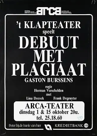 - ↑ 't Klapteater speelt Debuut met plagiaat - Gaston Burssens : Arca-teater dinsdag 1 & 15 oktober 20 u. lib.ugent.be. Geraadpleegd op 31 augustus 2020.
