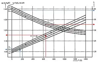 (Rode lijnen) De verbrandingskamer werkt met lucht, vermengd met verbrandingsgassen. Daarvoor moet men eerst weten wat het brandstofpercentage in de lucht is. Stel dat dit 2% bedraagt, dan zijn de lijnen voor Cp en k waar brandstofpercentage 2 bij staat van toepassing.